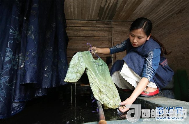 5月2日,在貴州省丹寨縣,張義蘋在染房內查看蠟染產(chǎn)品的染色效果。