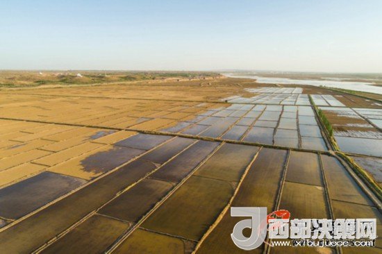5月6日18時(shí)50分許,伴著落日金色的余暉,銀川市賀蘭縣黃河邊剛剛灌水的稻田波光粼粼,銀川平原引黃灌區(qū)稻田灌水,即將進(jìn)入插秧季。 寧夏新聞網(wǎng)記者 祁瀛濤 攝