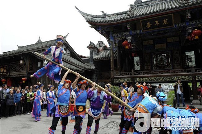 演員在汶川縣水磨鎮(zhèn)萬年臺進行民俗表演(2012年5月23日攝)。新華社發(fā)(王飛 攝)