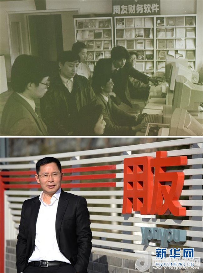 拼版照片:上圖為1989年的用友;下圖為用友網(wǎng)絡(luò)董事長(zhǎng)兼CEO王文京(資料照片)。用友是中關(guān)村第一個(gè)拿到私營(yíng)高新技術(shù)企業(yè)牌照的企業(yè),編號(hào)“SY0001”。從創(chuàng)業(yè)時(shí)2個(gè)人的軟件服務(wù)社,到30年后的1.5萬人,用友正從管理軟件公司向?yàn)槠髽I(yè)“賦能”的知名云服務(wù)企業(yè)邁進(jìn)。新華社發(fā)