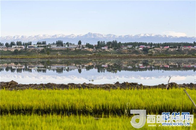 在新疆察布查爾錫伯自治縣種羊場托海依村拍攝的一處農(nóng)田,秧苗與遠(yuǎn)處的雪山相映成趣(5月21日攝)。近日,隨著氣溫漸高,地處新疆伊犁河谷的察布查爾錫伯自治縣迎來插秧高峰期,田間地頭一派繁忙景象。塊塊稻田水滿如鏡,田間防護(hù)林枝繁葉茂,遠(yuǎn)處雪山依稀可見,如一幅在大地上鋪展開的生態(tài)畫卷。新華社記者胡虎虎攝