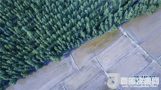 在新疆察布查爾錫伯自治縣扎庫齊牛錄鄉(xiāng)拍攝的一處防護(hù)林旁的水稻田(5月21日無人機拍攝)。近日,隨著氣溫漸高,地處新疆伊犁河谷的察布查爾錫伯自治縣迎來插秧高峰期,田間地頭一派繁忙景象。塊塊稻田水滿如鏡,田間防護(hù)林枝繁葉茂,遠(yuǎn)處雪山依稀可見,如一幅在大地上鋪展開的生態(tài)畫卷。新華社記者胡虎虎攝
