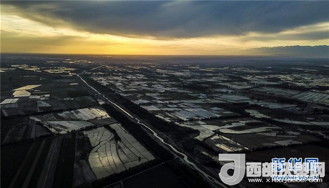 在新疆察布查爾錫伯自治縣種羊場托海依村拍攝的夕陽下的農(nóng)田(5月21日無人機拍攝)。近日,隨著氣溫漸高,地處新疆伊犁河谷的察布查爾錫伯自治縣迎來插秧高峰期,田間地頭一派繁忙景象。塊塊稻田水滿如鏡,田間防護(hù)林枝繁葉茂,遠(yuǎn)處雪山依稀可見,如一幅在大地上鋪展開的生態(tài)畫卷。新華社記者胡虎虎攝