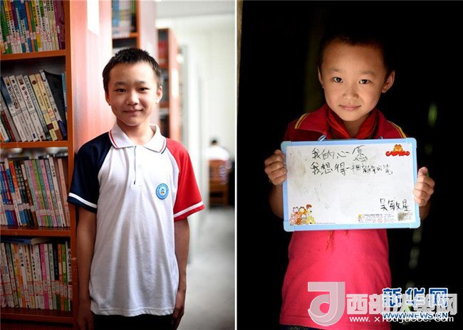 這是一張拼版圖片。左圖為2018年5月30日,在廣西三江侗族自治縣洋溪鄉(xiāng)中學(xué),12歲的吳敏星在圖書(shū)館里留影;右圖為2014年5月26日,吳敏星在吊腳樓教室里展示他的“六一”心愿。