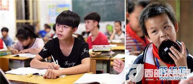 這是一張拼版圖片。左圖為2018年5月30日,在廣西三江侗族自治縣洋溪鄉(xiāng)中學(xué),15歲的秦保軍在教室里上課;右圖為2014年6月10日,秦保軍在吊腳樓教室里吃愛(ài)心人士送來(lái)的節(jié)日蛋糕。