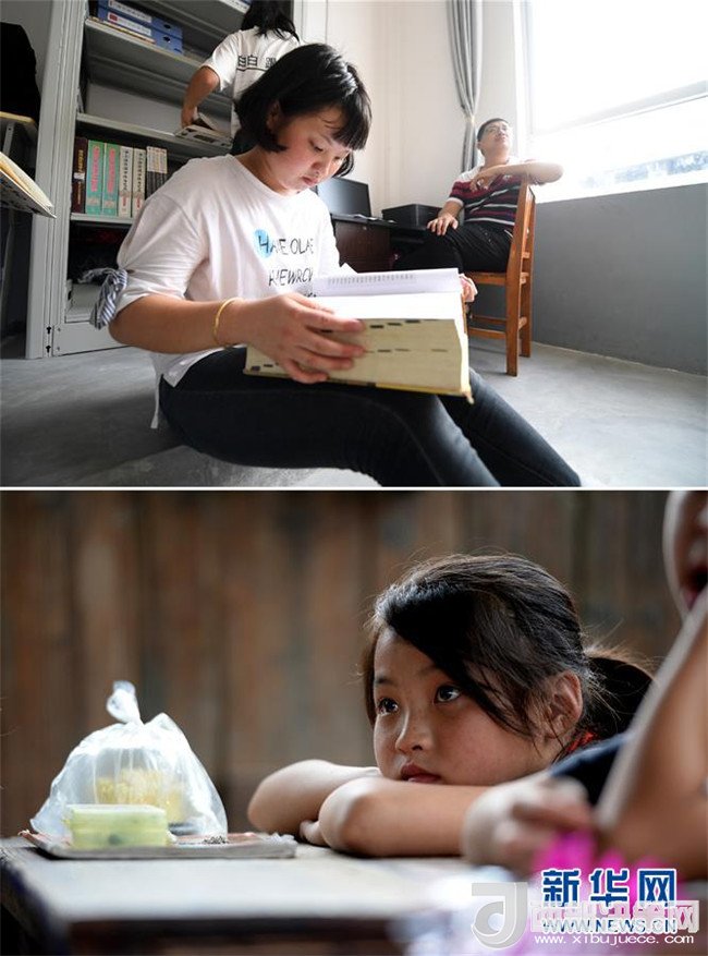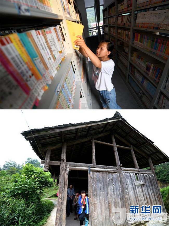 這是一張拼版圖片。上圖為2018年5月30日,在廣西三江侗族自治縣洋溪鄉(xiāng)中學(xué),13歲的吳美新在圖書(shū)館里看書(shū);下圖為2014年5月26日,吳美新站在吊腳樓教室門(mén)口張望。