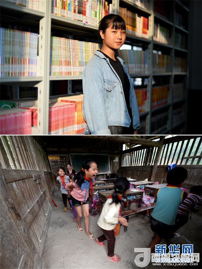 這是一張拼版圖片。上圖為2018年5月30日,在廣西三江侗族自治縣洋溪鄉(xiāng)中學(xué),14歲的吳瑩瑩在圖書(shū)館里留影;下圖為2014年6月10日,吳瑩瑩(前三)和同學(xué)們?cè)诘跄_樓教室里做游戲。