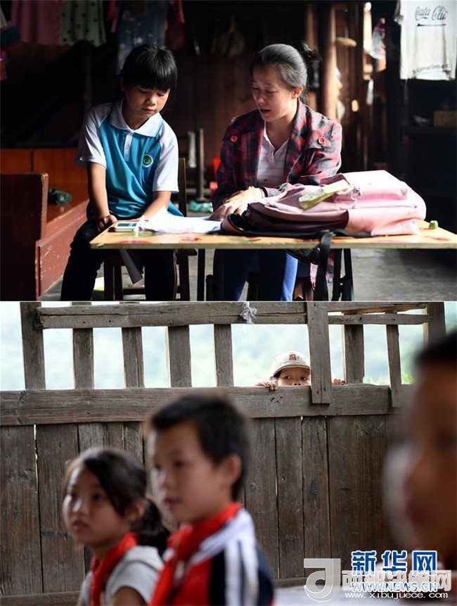 這是一張拼版圖片。上圖為2018年5月31日,在廣西三江侗族自治縣安馬村寨全屯,駐村工作隊(duì)員唐莉越入戶給10歲的彭桂花(左)輔導(dǎo)功課;下圖為2014年6月10日,即將入學(xué)的彭桂花在寨全教學(xué)點(diǎn)的吊腳樓教室外張望。
