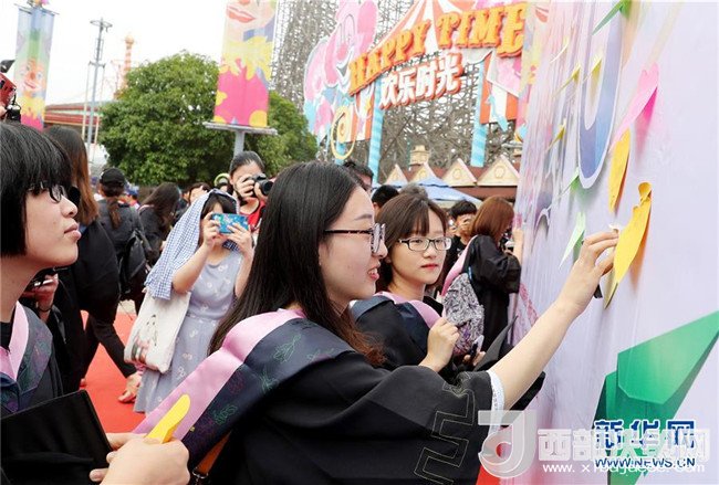 6月10日,畢業(yè)生們?cè)跉g樂谷廣場上拍合影。新華社記者 方喆攝