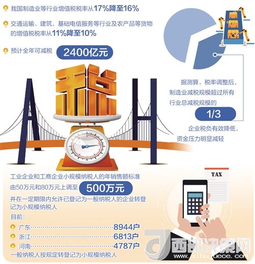 從5月1日起,我國制造業(yè)等行業(yè)增值稅稅率從17%降至16%,交通運輸、建筑、基礎(chǔ)電信服務(wù)等行業(yè)及農(nóng)產(chǎn)品等貨物的增值稅稅率從11%降至10%,預(yù)計全年可減稅2400億元。