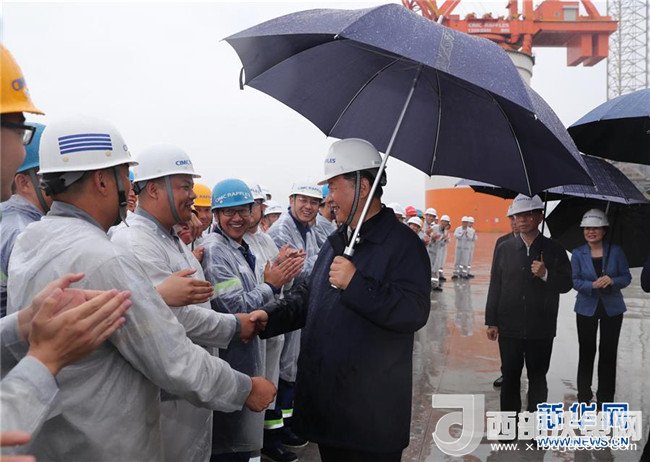 風(fēng)急云低,雨流如注。13日下午,習(xí)近平來(lái)到中集來(lái)福士海洋工程有限公司煙臺(tái)基地。作為國(guó)內(nèi)率先進(jìn)入海洋工程行業(yè)的企業(yè),中集來(lái)福士用10年左右時(shí)間,國(guó)產(chǎn)化率從不足10%提高到60%。在廠區(qū)碼頭上,習(xí)近平撐著雨傘,趟著積水,近距離察看??吭谶@里的自升式修井生活平臺(tái),遠(yuǎn)眺“藍(lán)鯨1號(hào)”超深水雙鉆塔半潛式鉆井平臺(tái)、“泰山”龍門吊、海洋牧場(chǎng)平臺(tái),向企業(yè)負(fù)責(zé)人詳細(xì)了解高端海洋工程設(shè)備制造、維護(hù)、運(yùn)行情況。海風(fēng)吹起了衣襟,雨水打濕了褲腿。習(xí)近平站在雨中,同圍攏過(guò)來(lái)的工人們一一握手、親切交談,向作業(yè)平臺(tái)上的工人們揮手致意。習(xí)近平指出,國(guó)有企業(yè)特別是中央所屬國(guó)有企業(yè),一定要加強(qiáng)自主創(chuàng)新能力,研發(fā)和掌握更多的國(guó)之重器。國(guó)有企業(yè)要深化改革創(chuàng)新,努力建成現(xiàn)代企業(yè)。要堅(jiān)持黨對(duì)國(guó)有企業(yè)的領(lǐng)導(dǎo)不動(dòng)搖,堅(jiān)持建強(qiáng)國(guó)有企業(yè)基層黨組織不放松,為做強(qiáng)做優(yōu)做大國(guó)有企業(yè)提供堅(jiān)強(qiáng)組織保證。