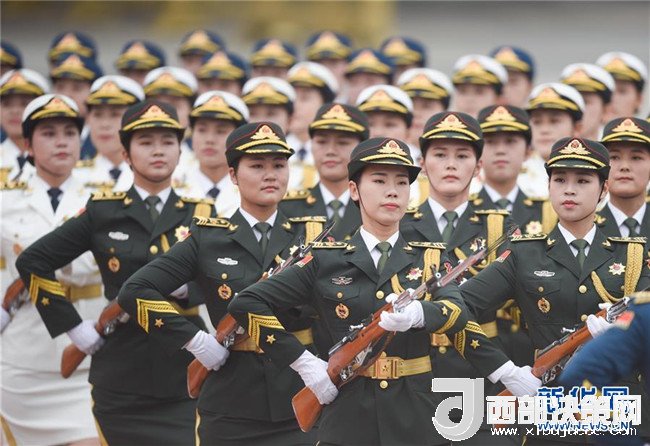 6月6日下午,國家主席習(xí)近平在人民大會堂東門外廣場舉行儀式,歡迎吉爾吉斯斯坦總統(tǒng)熱恩別科夫?qū)χ袊M行國事訪問。這是在歡迎儀式上首次增加的三軍儀仗隊女兵方陣。新華社記者 陳曄華 攝