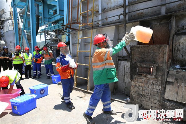 工人正在將毒品拋向高溫熔爐。劉政寧 攝
