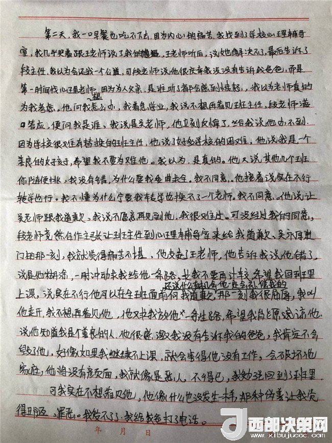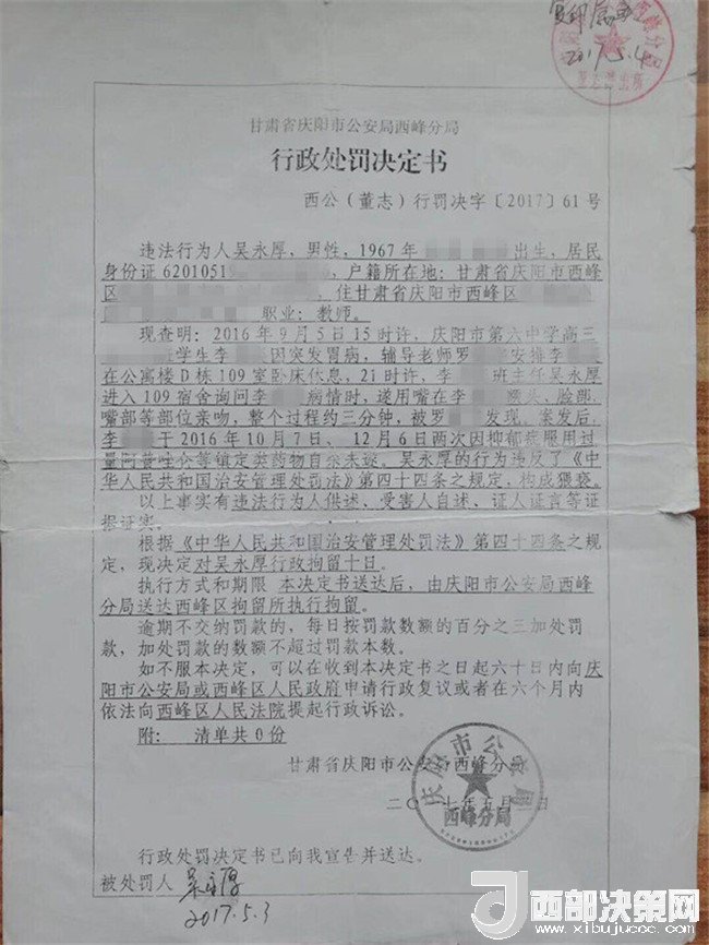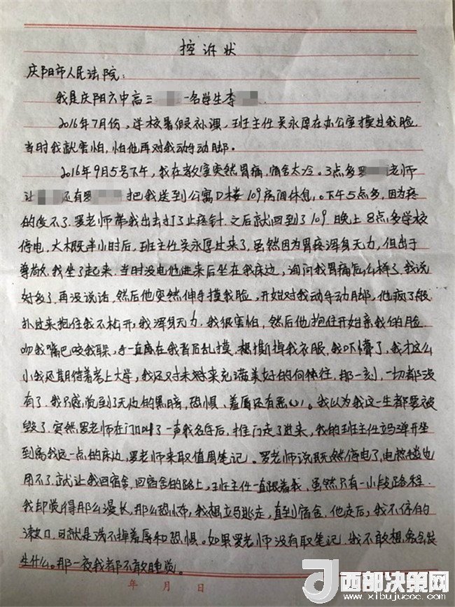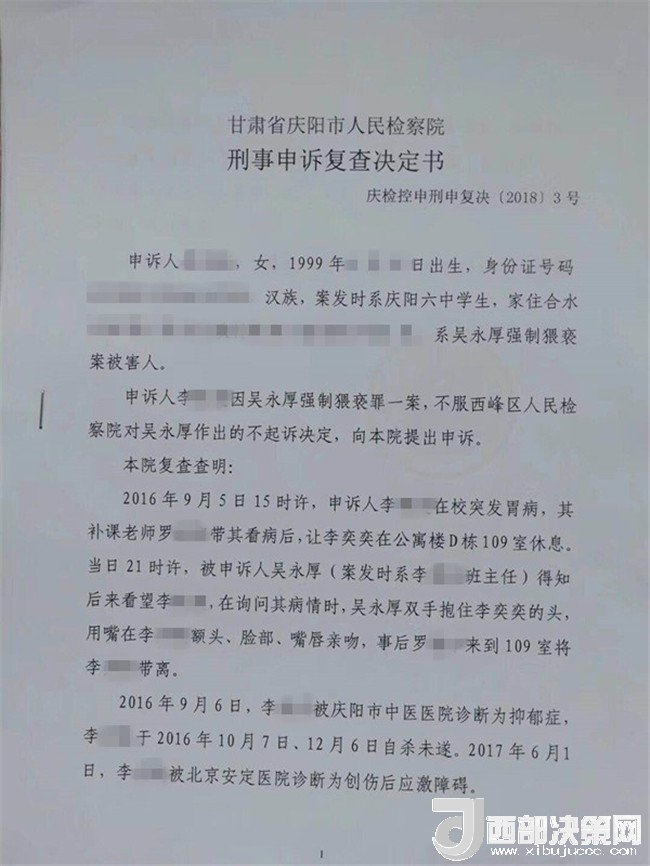 孩子叫李某奕,1999年4月出生,原慶陽(yáng)六中高三(二)班學(xué)生,平時(shí)活潑開(kāi)朗,勤奮好學(xué),成績(jī)?cè)诎嗉?jí)前列。然而,噩夢(mèng)從2016年9月開(kāi)始了。2016年9月5日下午,當(dāng)時(shí)正在慶陽(yáng)六中讀高三的李某奕突然胃疼,因?yàn)樗奚岜容^冷,被老師安排在教師公寓休息。晚上8點(diǎn)半左右,班主任吳某厚以探病為由進(jìn)入女兒休息的房間,詢問(wèn)過(guò)后便開(kāi)始摸臉、親吻、咬耳朵、摟抱李某奕,后因安排她休息的老師進(jìn)房間取東西才停止。此后她心里就有了陰影。她先找到學(xué)校心理輔導(dǎo)老師哭訴了自己的遭遇,心理輔導(dǎo)老師解決不了,又告訴了政教主任段老師。交談中段主任得知孩子的訴求是不想見(jiàn)到這位涉事老師,就答應(yīng)其要求。并肯定了孩子沒(méi)告訴家長(zhǎng)是對(duì)的。