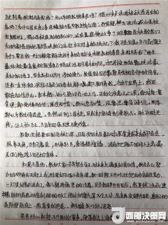 孩子的病情一直不見(jiàn)好轉(zhuǎn),主治醫(yī)生和心理輔導(dǎo)老師都說(shuō)要打開(kāi)孩子的心結(jié),而孩子的心結(jié)就在學(xué)校一直沒(méi)有給她一個(gè)公正的說(shuō)法。在斷斷續(xù)續(xù)上學(xué)過(guò)程中,他多次找過(guò)學(xué)校。起初學(xué)校還和他談,后來(lái)學(xué)校說(shuō)他們是組織教學(xué)的地方,處理教師的事管不了,要找教育局,直接就不理他了。再后來(lái)他連門都進(jìn)不去了。
