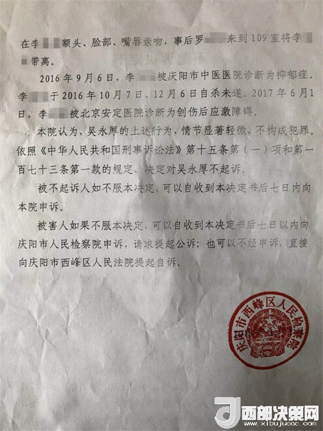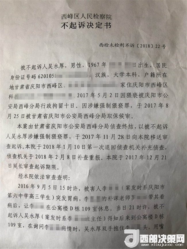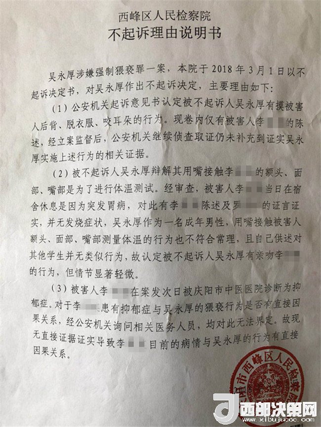 2017年2月26日,李某奕在父親陪同下到公安機(jī)關(guān)報(bào)案,稱被其班主任吳某厚猥褻,要求查處。經(jīng)辦案部門調(diào)查,2017年5月2日,公安機(jī)關(guān)依據(jù)《中華人民共和國(guó)治安管理處罰法》第四十四條之規(guī)定,以猥褻行為對(duì)吳某厚處以行政拘留十日處罰。其間,李某奕父親認(rèn)為公安局處罰不當(dāng),到西峰區(qū)人民檢察院進(jìn)行申訴。區(qū)檢察院調(diào)閱案卷后認(rèn)為吳某厚的行為涉嫌犯罪,書(shū)面通知公安局立案?jìng)刹椤9簿钟?017年8月10日立為刑事案件。8月25日對(duì)吳某厚采取取保候?qū)彺胧?1月20日偵查終結(jié)后移送起訴至區(qū)檢察院。區(qū)檢察院審查后認(rèn)為吳某厚的行為“情節(jié)顯著輕微,不構(gòu)成犯罪”,“決定對(duì)吳某厚不起訴”,并出具《不起訴理由說(shuō)明書(shū)》。提出不起訴的三個(gè)理由,包括“公安機(jī)關(guān)繼續(xù)偵查取證仍未補(bǔ)充到吳某厚實(shí)施上述行為的相關(guān)證據(jù)”、“吳某厚有親吻李某奕的行為,但情節(jié)顯著輕微”、“無(wú)直接證據(jù)證實(shí)導(dǎo)致李某奕目前的病情與吳某厚的行為有直接因果關(guān)系”,于2018年3月1日作出不起訴決定。李某奕遂到慶陽(yáng)市人民檢察院進(jìn)行申訴。5月18日,市檢察院維持區(qū)檢察院不起訴決定。6月25日晚,據(jù)李某奕父親講,他已將申訴材料寄至甘肅省人民檢察院。