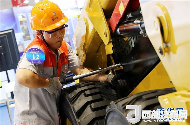 在第45屆世界技能大賽全國選拔賽上海賽區(qū)比賽中,一名重型車輛維修項目參賽選手在緊螺絲(6月13日攝)。新華社記者 方喆 攝