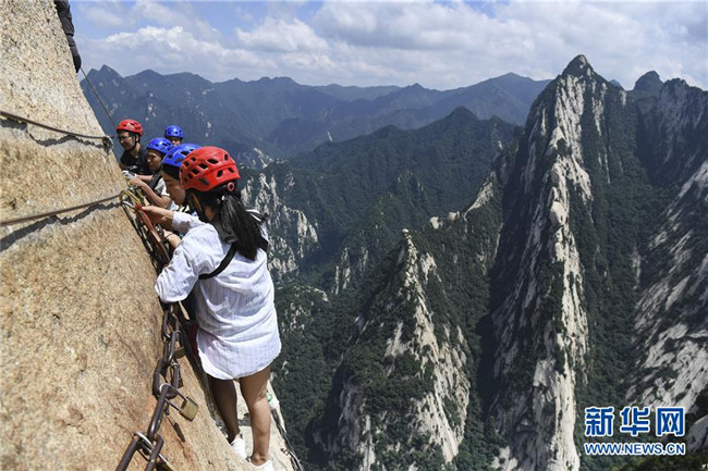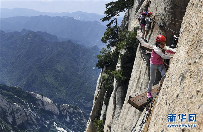 被譽(yù)為“華山第一天險(xiǎn)”的長(zhǎng)空棧道,位于陜西省華陰市五岳華山南峰東側(cè)山腰,在萬(wàn)仞絕壁上鑲嵌石釘搭木椽而筑。 由于長(zhǎng)空棧道貼崖懸空,對(duì)探險(xiǎn)獵奇者極具誘惑性和挑戰(zhàn)性,吸引歷險(xiǎn)探勝者絡(luò)繹不絕。新華社記者 陶明 攝
