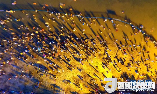 7月18日,市民在廣西柳州市金沙角人工沙灘上戲水消暑(無(wú)人機(jī)拍攝)。