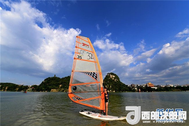 7月18日,在廣西柳州市金沙角水域,一名帆板愛(ài)好者在江面上練習(xí)帆板。