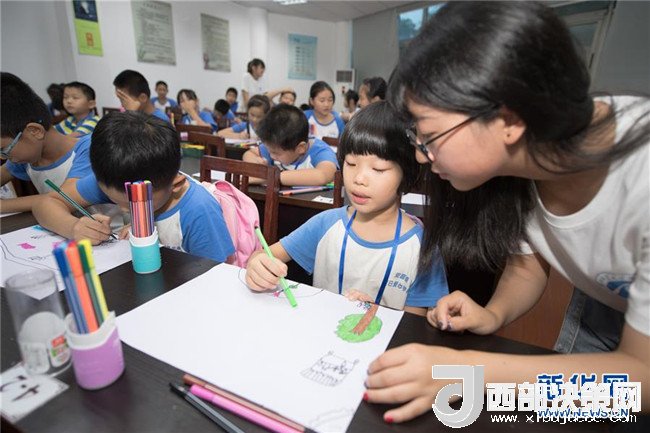 7月26日,在柯橋區(qū)安昌街道社區(qū)文化禮堂,大學(xué)生志愿者陪同“小候鳥”上美術(shù)課。