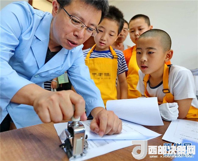 8月2日,河北秦皇島市檔案館工作人員向前來體驗(yàn)檔案文化的海港區(qū)紅旗里社區(qū)的小朋友演示檔案處理裝訂的過程。
