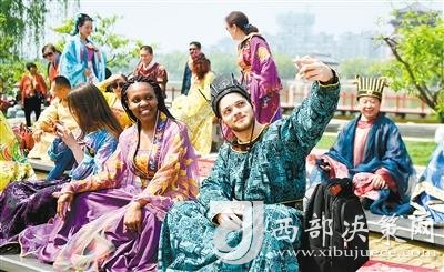 在大唐芙蓉園,身著唐朝服飾的外國(guó)游客。
