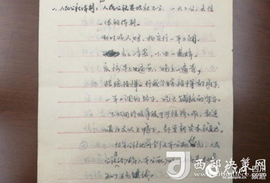 這本工作筆記內頁紙上的字跡娟秀工整,細密地記錄著對人民公社的一些看法:“人民公社是政社不分、一大二公、五位一體的體制;出工一條龍,收工一窩蜂;不僅用行政手段干預經濟工作,就連喂10只以上的鴨子都要割‘尾巴’……”。