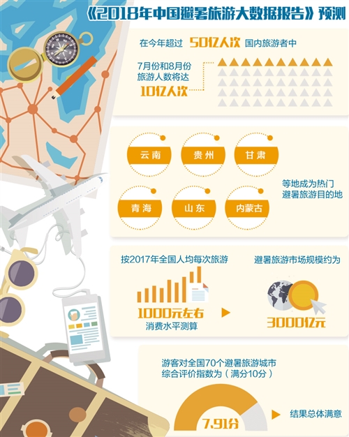 據(jù)中國旅游研究院等單位發(fā)布的《2018年中國避暑旅游大數(shù)據(jù)報(bào)告》(下稱《報(bào)告》)預(yù)測,在今年超過50億人次國內(nèi)旅游者中,7月份和8月份旅游人數(shù)將達(dá)10億人次,占全年游客數(shù)量的五分之一。其中,避暑旅游規(guī)模預(yù)計(jì)占一半,約5億人次。《報(bào)告》稱,這一數(shù)字將使中國成為全球最大的避暑旅游市場。