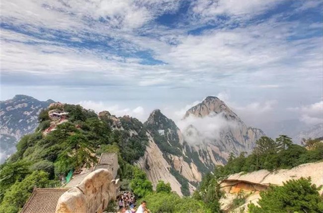 西峰海拔2082.6米,華山主峰之一,因位置居西得名。又因峰巔有巨石形狀好似蓮花瓣,古代文人多稱其為蓮花峰、芙蓉峰。袁宏道在他的《華山》中記述:“石葉上覆而橫裂”;徐霞客《游太華山日記》中也記述:“峰上石聳起,有石片覆其上,如荷花。”李白詩中有“石作蓮花云作臺(tái)”句,也當(dāng)指此石。
