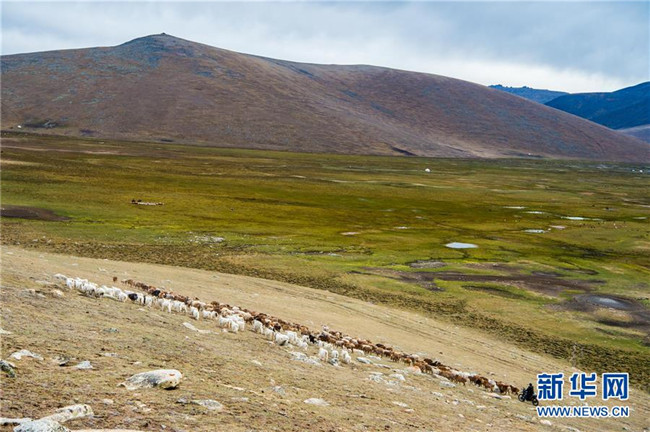 在青河縣查干郭勒鄉(xiāng)薩爾布拉克村,胡賽因·哈力都拉趕著羊群轉場(8月25日無人機拍攝)。新華社記者江文耀攝