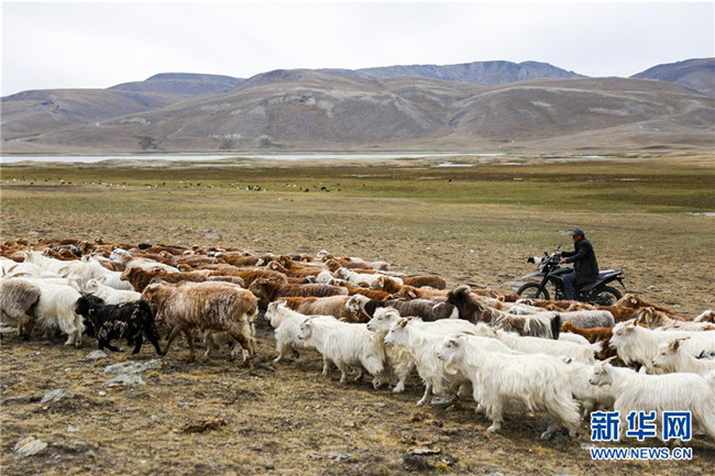 在青河縣查干郭勒鄉(xiāng)薩爾布拉克村,胡賽因·哈力都拉騎著網(wǎng)購來的新摩托放牧(8月25日攝)。新華社記者江文耀攝