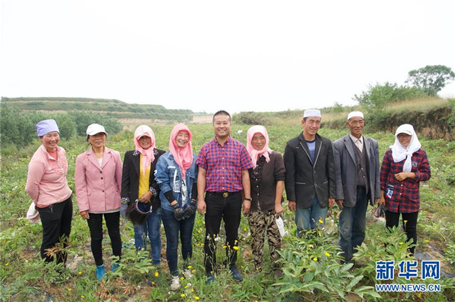來自福建長樂的林錦云(右五)在寧夏固原市河川鄉(xiāng)與當?shù)剞r(nóng)戶合影(8月28日攝)。2014年,林錦云通過土地流轉(zhuǎn)方式,承包了河川鄉(xiāng)1.5萬畝荒山,打造油用牡丹生產(chǎn)基地。目前,林錦云種下的7600畝油用牡丹已經(jīng)開始受益,公司已就近吸納村民300多人就業(yè),其中建檔立卡戶39戶,人均年收入2萬多元。 新華社記者姜克紅攝