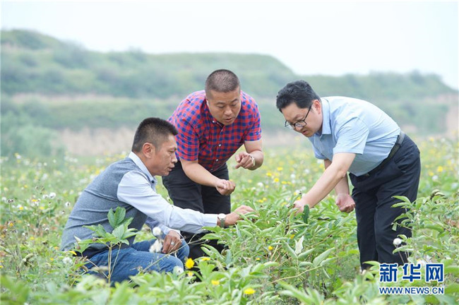 來自福建長樂的林錦云(中)在寧夏固原市河川鄉(xiāng)與福建對口支援農(nóng)業(yè)專家(右)交流牡丹生長情況(8月28日攝)。2014年,林錦云通過土地流轉(zhuǎn)方式,承包了河川鄉(xiāng)1.5萬畝荒山,打造油用牡丹生產(chǎn)基地。目前,林錦云種下的7600畝油用牡丹已經(jīng)開始產(chǎn)生效益,公司就近吸納村民300多人就業(yè),其中建檔立卡戶39戶,人均年收入2萬多元。 新華社記者王鵬攝