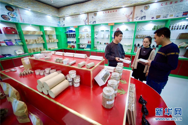 林玉清在寧夏固原市西吉縣寧夏澤艾堂生物科技有限公司查看艾草產(chǎn)品(8月30日攝)。來自福建莆田的林玉清2017年3月在西吉縣成立寧夏澤艾堂生物科技有限公司,依托西吉縣優(yōu)質(zhì)的艾草種植條件,采用“公司+合作社+農(nóng)戶”的訂單農(nóng)業(yè)合作模式,與吉強、新營等鄉(xiāng)鎮(zhèn)種植專業(yè)合作社合作建成艾草種植基地11個、推廣種植艾草6000畝,為當?shù)厝罕娒撠氈赂讳伨托侣纷?。新華社記者郭緒雷攝