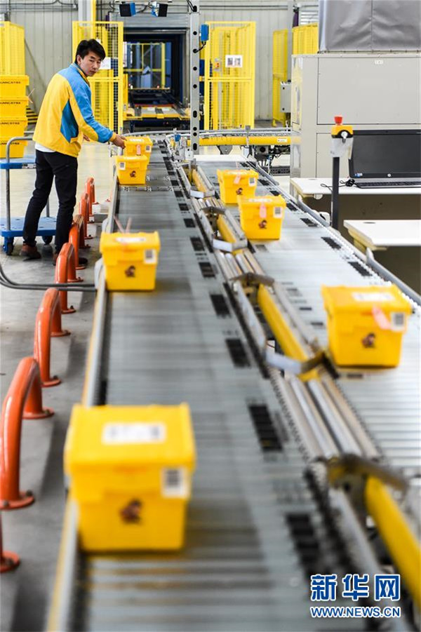 在江蘇南京蘇寧云倉物流基地,工作人員將包裝好的“共享快遞盒”放到傳送帶上,準(zhǔn)備進(jìn)行分揀運輸(2017年10月31日攝)。新華社記者 李博 攝