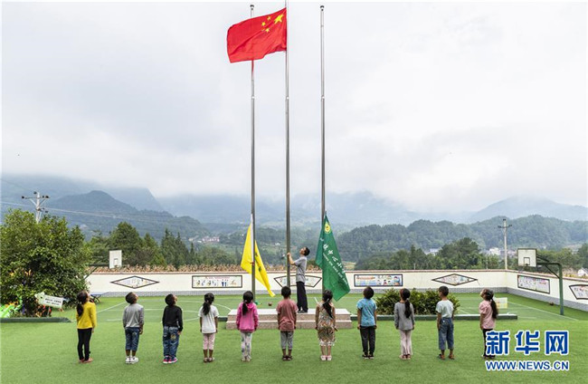 9月6日,在重慶市南川區(qū)大有鎮(zhèn)水源村僑心小學(xué),教師江開華和孩子們一起參加升旗儀式。