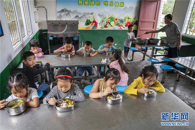 9月6日,在重慶市南川區(qū)大有鎮(zhèn)水源村僑心小學(xué),教師江開華照顧孩子們吃午飯。新華社發(fā)(瞿明斌攝)