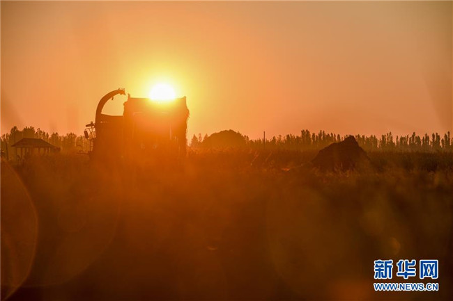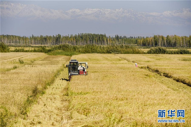 9月26日,收割機(jī)在新疆察布查爾錫伯自治縣納達(dá)齊牛錄鄉(xiāng)的一處稻田收割水稻。眼下,地處新疆伊犁河谷的察布查爾錫伯自治縣約20萬(wàn)畝水稻迎來(lái)收割季。當(dāng)?shù)剞r(nóng)民搶抓農(nóng)時(shí),忙碌在金色田園中。記者 胡虎虎 攝