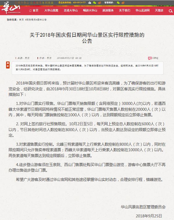 2018年國(guó)慶假日即將來(lái)臨,預(yù)計(jì)屆時(shí)華山景區(qū)將迎來(lái)客流高峰,為了確保游客的出行和游覽安全,經(jīng)研究決定,自2018年9月30日18時(shí)至10月8日8時(shí),對(duì)景區(qū)客流實(shí)行限控措施。具體措施如下: