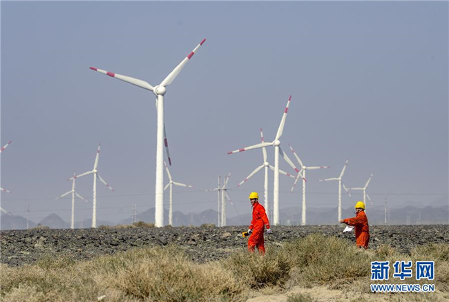 在烏魯木齊近郊的達坂城風(fēng)力發(fā)電場,兩位工作人員在巡檢風(fēng)力發(fā)電設(shè)備(9月18日攝)。