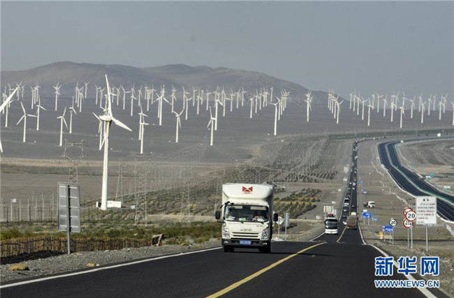 汽車行駛在新疆吐魯番市郊區(qū)風(fēng)力發(fā)電場一旁的公路上(9月22日攝)。記者趙戈 攝