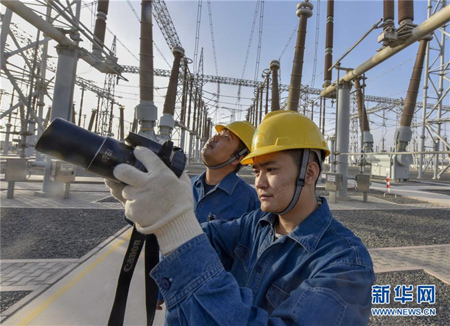 在吐魯番市750千伏變電站,兩位工作人員利用專用設(shè)備對電力設(shè)施進行檢查(9月18日攝)。記者趙戈 攝