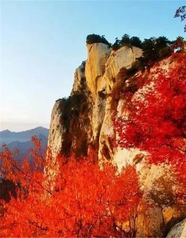 這里的秋天更容易令人迷醉,一步一景步步生情,這里溫度適中,紅葉滿山,山崖為底,松檜為墨,是登山拍攝的最佳季節(jié)。秋風好比一支神奇的彩筆,肆意揮灑,將華山繪成了一幅燦爛的畫卷。從山腳下的郁郁蔥蔥到山頂上的紅黃相間,華山上的每一個臺階都浸染在了紅葉的絢爛中。