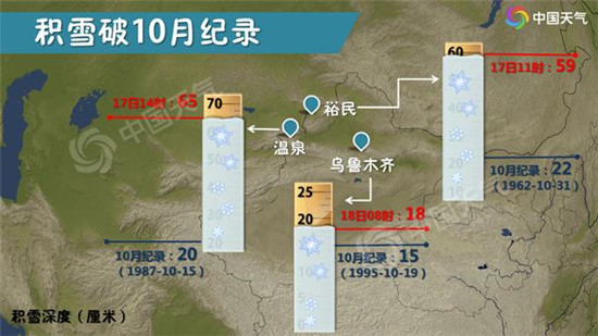 受強冷空氣影響,17日新疆伊犁河谷平原地區(qū)出現(xiàn)近28年以來最早大范圍初雪,首府烏魯木齊也降下今年下半年的初雪,較常年初雪日10月23日(1981-2010年)略早。昨天早晨降雪持續(xù),8時烏魯木齊積雪已經(jīng)達到18厘米,打破了當?shù)?0月份的積雪紀錄,并且最低氣溫首度“破冰”只有-1℃。受其影響嗎,新疆暴雪、大風、寒潮、霜凍、道路結冰、沙塵暴6個預警齊發(fā),惡劣天氣為農(nóng)牧業(yè)生產(chǎn)、林果業(yè)、交通旅游、城市運行等帶來了不利影響。