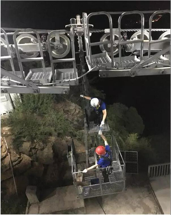 站在支架頂上,迪冰瑤用雙手將100斤重的導(dǎo)鏈吃力地舉過(guò)頭頂安裝固定好,然后開(kāi)始校正鋼索。