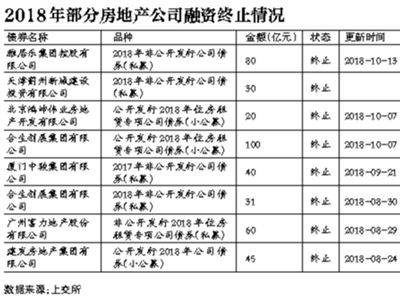 2018年10月份以來(lái),已經(jīng)有多起涉房融資計(jì)劃中止/終止。上交所信息顯示,截至10月25日,已經(jīng)至少有8筆涉房融資計(jì)劃中止或終止審查。諸如,雅居樂(lè)擬發(fā)行的80億元非公開(kāi)發(fā)行公司債券“終止”,該筆公司債曾于今年7月“中止”發(fā)行。合生創(chuàng)展100億規(guī)模的租賃住宅專項(xiàng)公司債券、天津薊州新城建設(shè)投資有限公司30億元的非公開(kāi)發(fā)行公司債券、北京鴻坤偉業(yè)房地產(chǎn)開(kāi)發(fā)有限公司20億元的住房租賃專項(xiàng)公司債券“終止”審查。10月份顯示“中止”融資計(jì)劃的有:中山招商-時(shí)代地產(chǎn)購(gòu)房尾款資產(chǎn)支持專項(xiàng)計(jì)劃,擬發(fā)行金額14.3億元;奧園集團(tuán)有限公司非公開(kāi)發(fā)行2018年住房租賃專項(xiàng)公司債,擬發(fā)行金額10億元,等等。