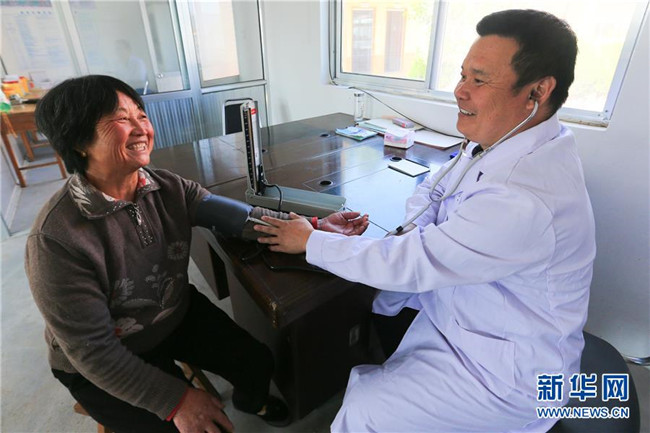 在山東蒙陰縣云夢(mèng)湖生態(tài)區(qū)東汶社區(qū)的農(nóng)村幸福院養(yǎng)老院的醫(yī)務(wù)室,醫(yī)生為老人測(cè)量血壓(10月11日攝)。2016年,東汶社區(qū)將原來(lái)的村兩委大院擴(kuò)建為農(nóng)村幸福院養(yǎng)老院,委派專(zhuān)人負(fù)責(zé)老人們的一日三餐。同時(shí)按照“子女交納、集體補(bǔ)助、社會(huì)捐贈(zèng)、財(cái)政獎(jiǎng)勵(lì)”的模式設(shè)立孝心養(yǎng)老基金,每月定時(shí)發(fā)給貧困老人。新華社記者 王南 攝
