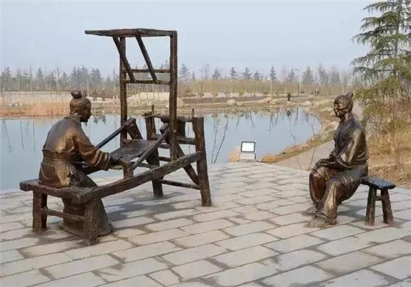 董永,相傳為東漢時期千乘人,年少喪母,因避兵亂遷居安陸。其后父親亡故,董永賣身至一富家為奴,換取喪葬費用。上工路上,于槐蔭下遇一女子,自言無家可歸,二人結為夫婦。女子以一月時間織成三百匹錦緞,為董永抵債贖身,返家途中,行至槐蔭,女子告訴董永:自己是天帝之女,奉命幫助董永還債。言畢凌空而去。因此,槐蔭改名為孝感。