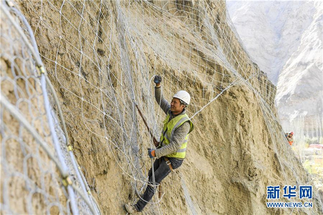 11月12日,在新疆塔什庫爾干塔吉克自治縣大同鄉(xiāng)鄉(xiāng)政府附近的一處路段,來自四川的吳飛在峭壁上安裝防護(hù)網(wǎng)。 近日,一支由四川、云南等地工人組成的施工隊忙碌在帕米爾高原深處的大山中,為塔什庫爾干塔吉克自治縣縣城至大同鄉(xiāng)道路的易落石路段安裝防護(hù)網(wǎng)。崇山峻嶺間,工人要攀爬至峭壁上施工作業(yè),如躍動在大山間的“舞者”。據(jù)介紹,這支施工隊常年活躍在新疆山區(qū)道路的施工現(xiàn)場,為風(fēng)險路段加裝安全防護(hù)裝置,保障過往車輛和沿途村民出行安全。 新華社記者 胡虎虎 攝